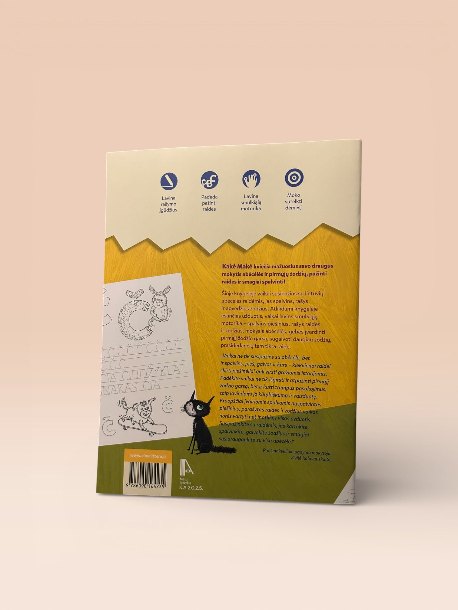 Vaikai ne tik susipažins su abėcėle, bet ir spalvins, pieš, galvos ir kurs – kiekvienai raidei skirti piešinėliai gali virsti gražiomis istorijomis. Padėkite vaikui ne tik išgirsti ir atpažinti pirmąjį žodžio garsą, bet ir kurti trumpus pasakojimus, taip lavindami jo kūrybiškumą ir vaizduotę. Kruopščiai įvairiomis spalvomis nuspalvintus piešinius, parašytas raides ir žodžius vaikas norės vartyti net ir atlikęs visas užduotis. Susipažinkite su raidėmis, jas kartokite, spalvinkite, galvokite žodžius ir smagiai susidraugaukite su visa abėcėle.