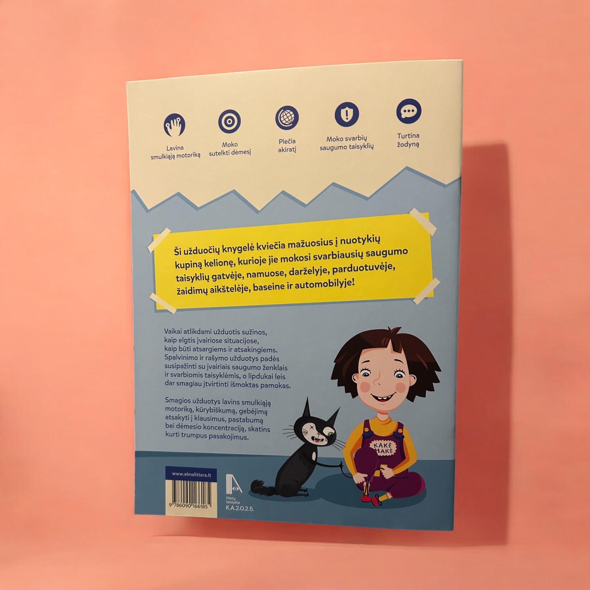 Vaikai atlikdami užduotis sužinos, kaip elgtis įvairiose situacijose, kaip būti atsargiems ir atsakingiems. Spalvinimo ir rašymo užduotys padės susipažinti su įvairiais saugumo ženklais ir svarbiomis taisyklėmis, o lipdukai leis dar smagiau įtvirtinti išmoktas pamokas.